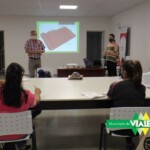 En el lugar los recibió la encargada de la actividad, diseñadora de indumentaria y textil y Walquiria Gieco que se encontraba enseñando a sus estudiantes con imágenes proyectadas términos relacionados a telas planas y de punto, fibras textiles y técnicas específicas de uso de cada uno de ellos.