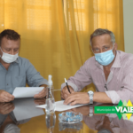 [22-04-2021] Esta mañana el presidente municipal Dr. Carlos Weiss, junto al secretario de Gobierno, Prof. Enzo Heft recibieron al Sr. Claudio Mior, apoderado de la empresa DH SH SRL. con el fin de firmar un convenio marco de cooperación para la recolección y reciclado de aceite vegetal usado de cocina.